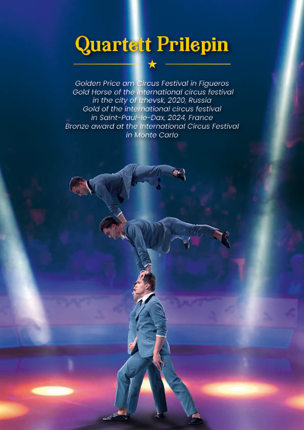 Plötzlich wird es still. Das Quartett Prilepin tritt auf – vier Körper, ein Atem, ein einziges Gedicht in Bewegung. Ihre Vertikalseil-Nummer ist so zart, so kunstvoll, dass du dich in der Musik und der Eleganz verlierst. Für einen Moment scheint alles schwerelos.