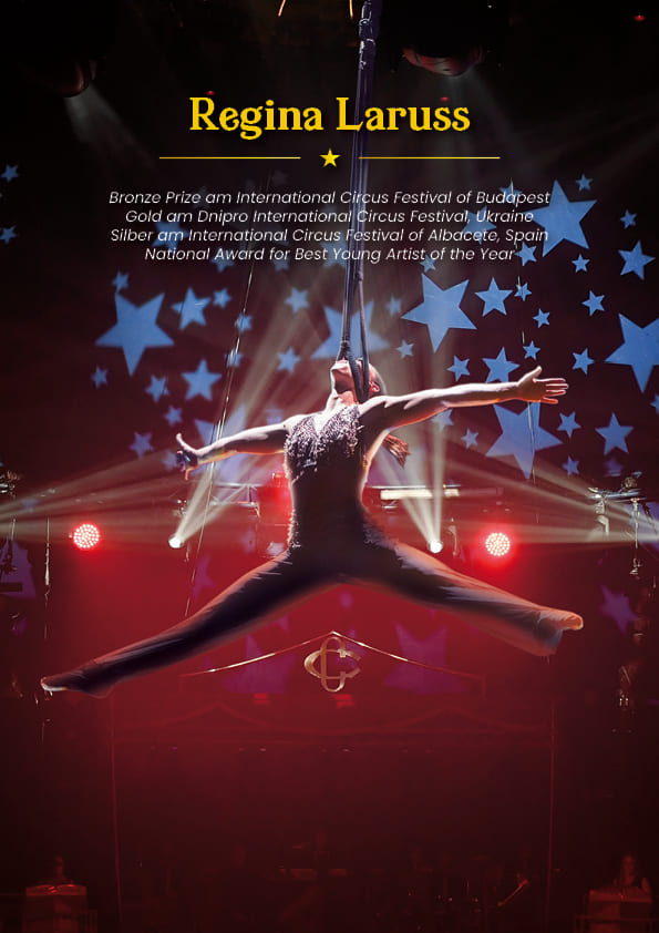 Dann kommt Regina Laruss in die Manege – die Meisterin der Illusion. Ein Tuch wird zur Taube, ein leerer Kasten zum Wunder. Du traust deinen Augen nicht – und genau das ist der Zauber. Sie lächelt kaum, doch in ihrer stillen Präsenz liegt pure Magie.