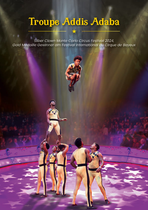 Mit einem Schlag wird es lebendig. Die Troupe Addis Ababa erfüllt die Manege mit Trommeln, Akrobatik und ansteckender Lebensfreude. Menschliche Pyramiden, fliegende Körper, leuchtende Augen – du spürst den Rhythmus, klatschst im Takt und fühlst dich mitten im Geschehen.
